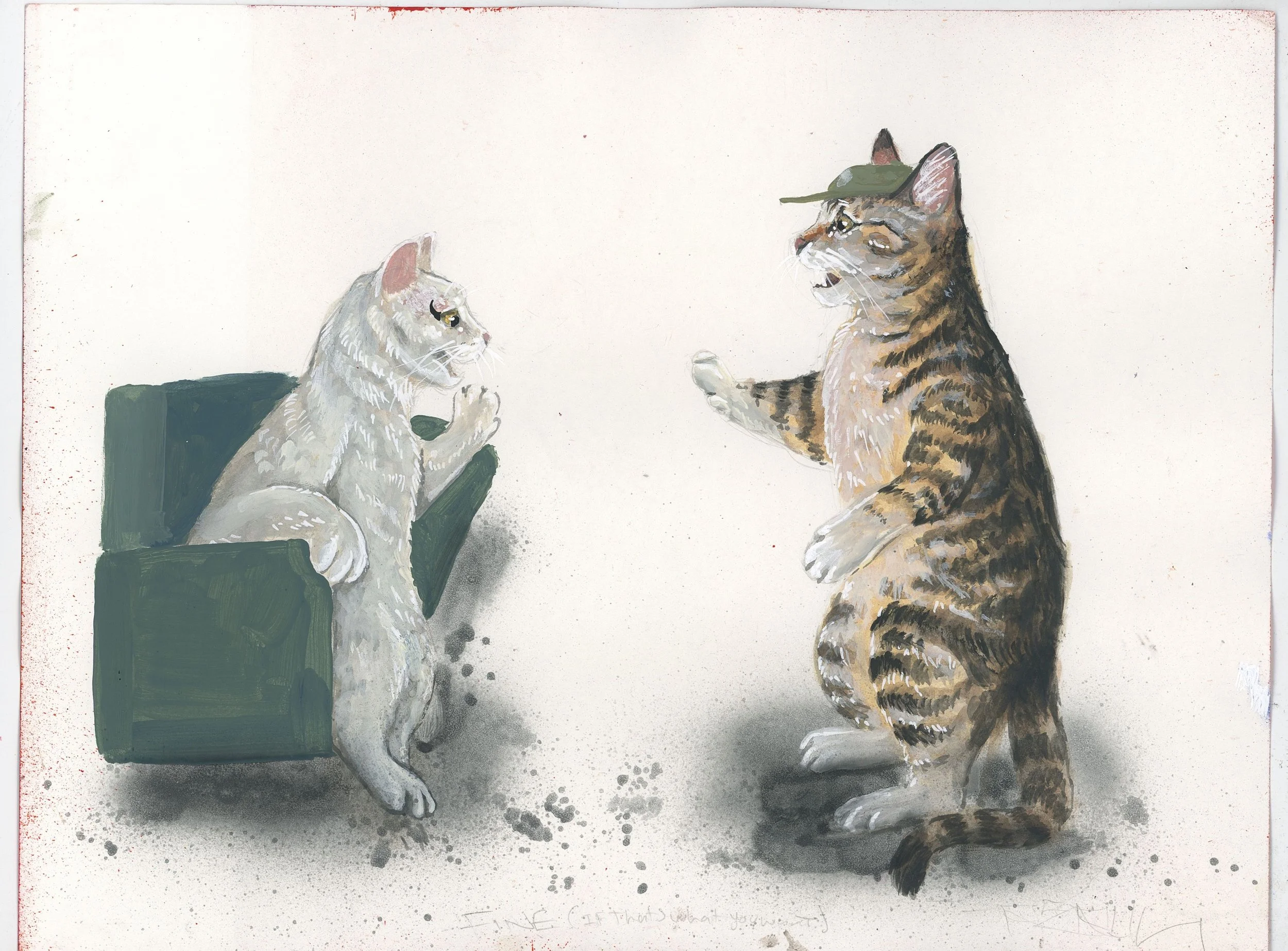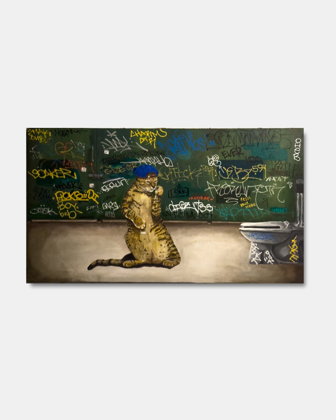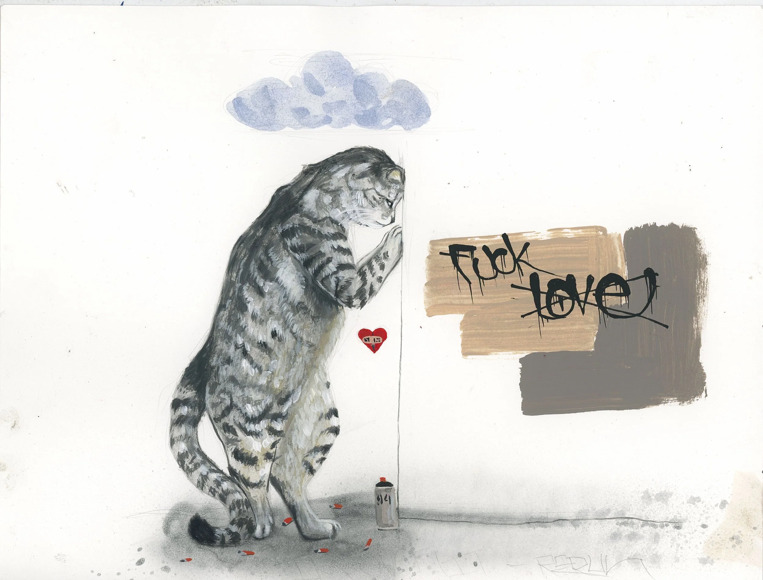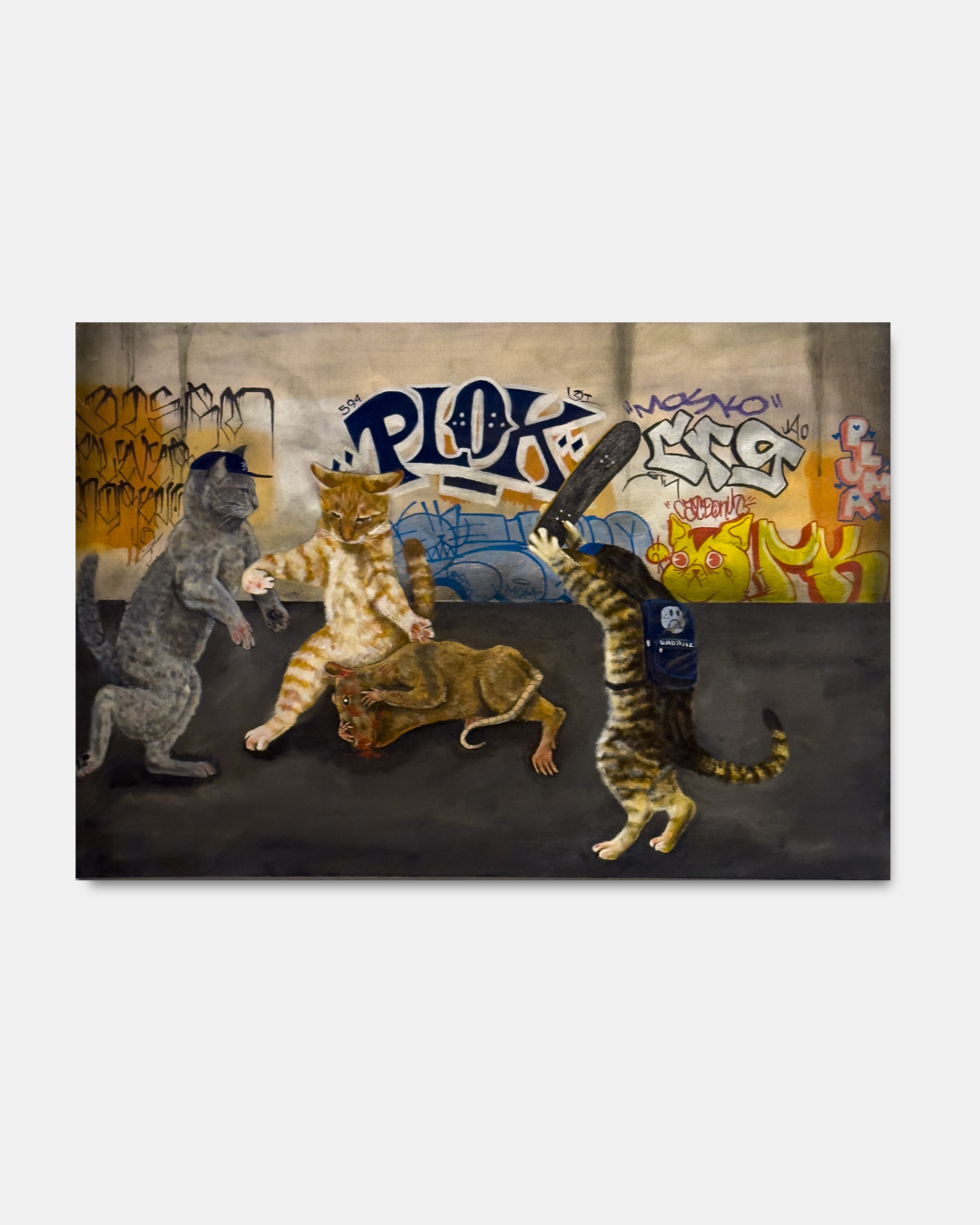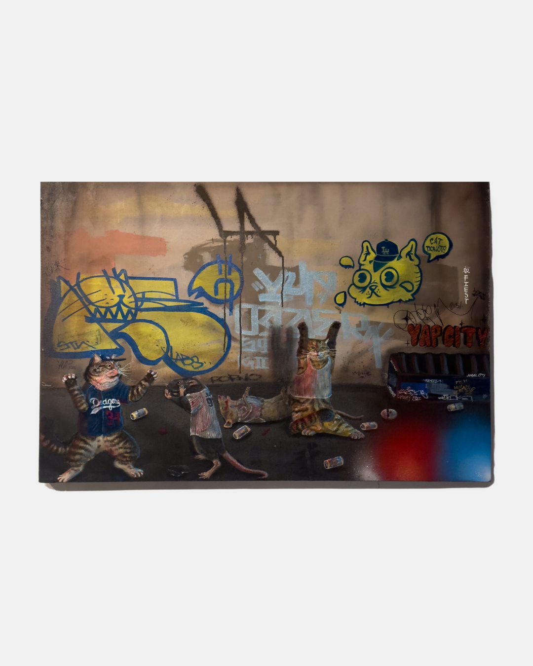 Rerun is a Los Angeles born and based artist whose work fuses the immediacy of graffiti with an evolving visual language rooted in humor, empathy, and transformation. Known for turning people into cats, he uses feline forms to mirror human behavior—quietly expressive, strange, and deeply familiar. His paintings carry the grit of the street and the intimacy of personal memory, shaped by a background in graffiti and inspired by artists like Van Gogh, Louis Wain, and Edvard Munch. Through found textures, pop references, and a disarming emotional clarity, Rerun builds a world where joy and sorrow share the same wall—and where everyone, at some point, is a cat.
